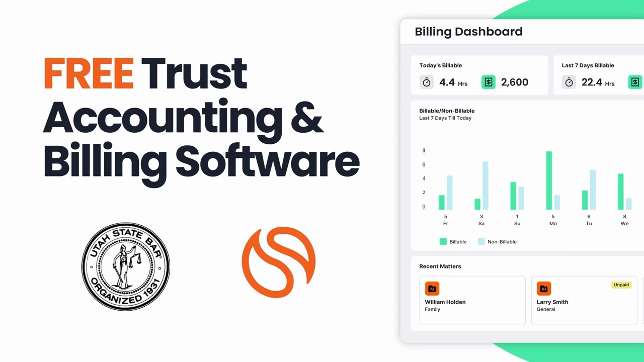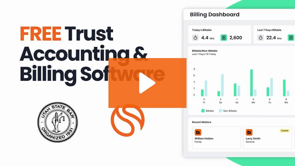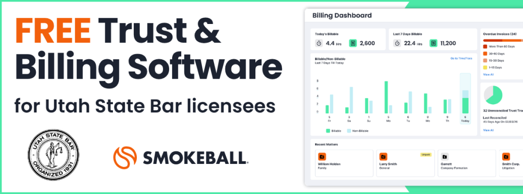 Free for licensees of the Utah State Bar, Smokeball Bill, trust & billing software helps law firms manage trust accounting compliantly, bill easily, and get paid faster.